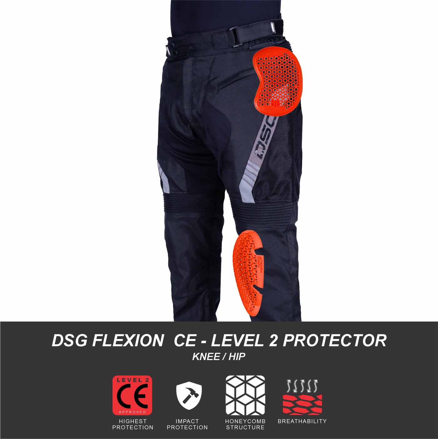 DSG Flexion CE Level 2 knee protectors for added safety.